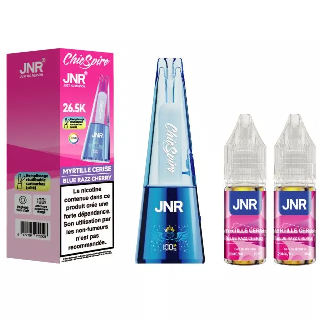 La Chicspire de JNR est une puff rechargeable jusqu'à 26 500 bouffées. Deux fioles de e-liquide JNR, saveur Myrtille et Cerise, accompagnent la puff, avec un dosage unique de 20 mg/ml en sels de nicotine.