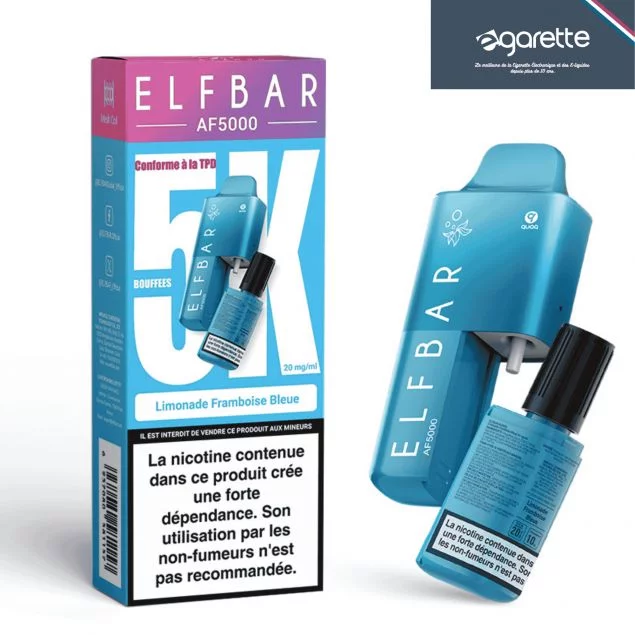 Avec les kits Elfbar AF 5000, vous profitez d'un réservoir additionnel d'une contenance XXL de 10 ml, pour environ 5000 bouffées saveur limonade et framboise bleue.
